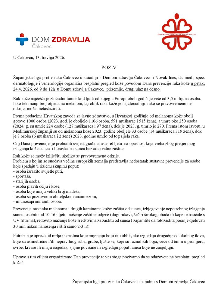 Dan prevencije raka kože – besplatni pregledi kože u Domu zdravlja Čakovec 24.04.2026.