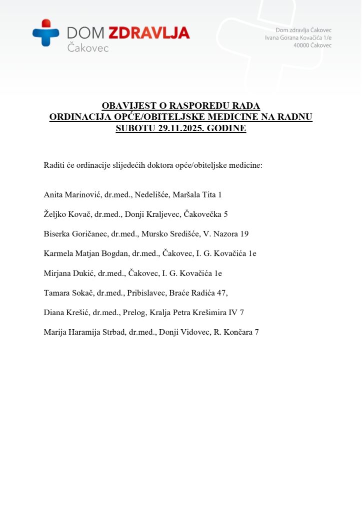 Obavijest o rasporedu rada ordinacija opće/obiteljske medicine na petu radnu subotu 29.11.2025.