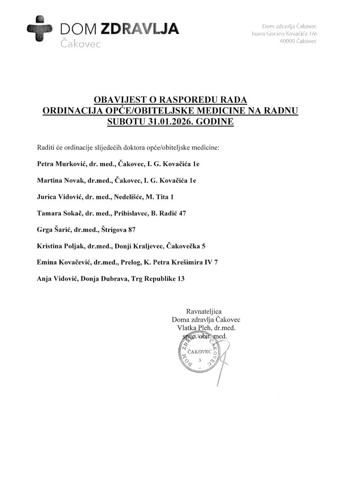 Obavijest o rasporedu rada ordinacija opće obiteljske medicine na radnu subotu 31.01.2026. godine