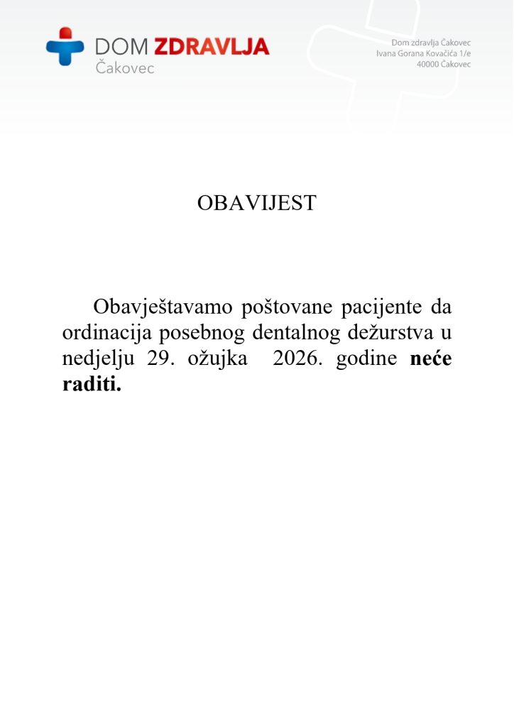 OBAVIJEST – ORDINACIJA POSEBNOG DENTALNOG DEŽURSTVA – 29.03.2026.