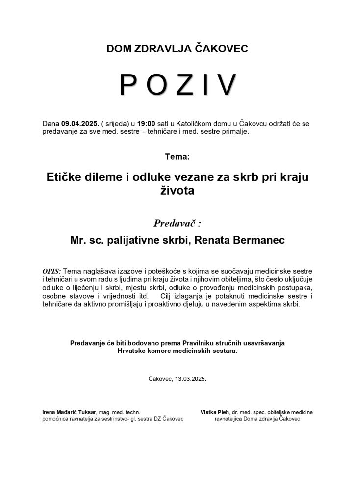 Poziv na predavanje: “Etičke dileme i odluke vezane za skrb pri kraju života” – 09.04.2025. ( srijeda) u 19:00 sati u Katoličkom domu u Čakovcu
