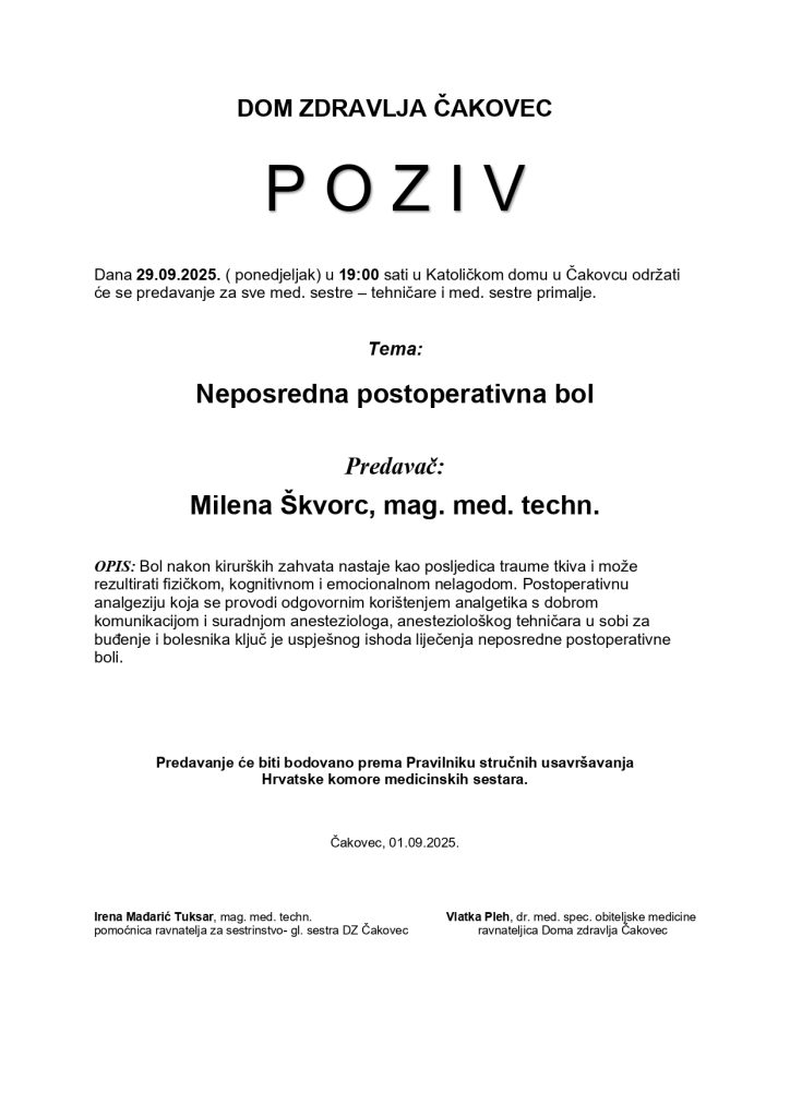 Poziv na predavanje “Neposredna postoperativna bol” – Čakovec, Katolički dom, 29.09.2025. godine