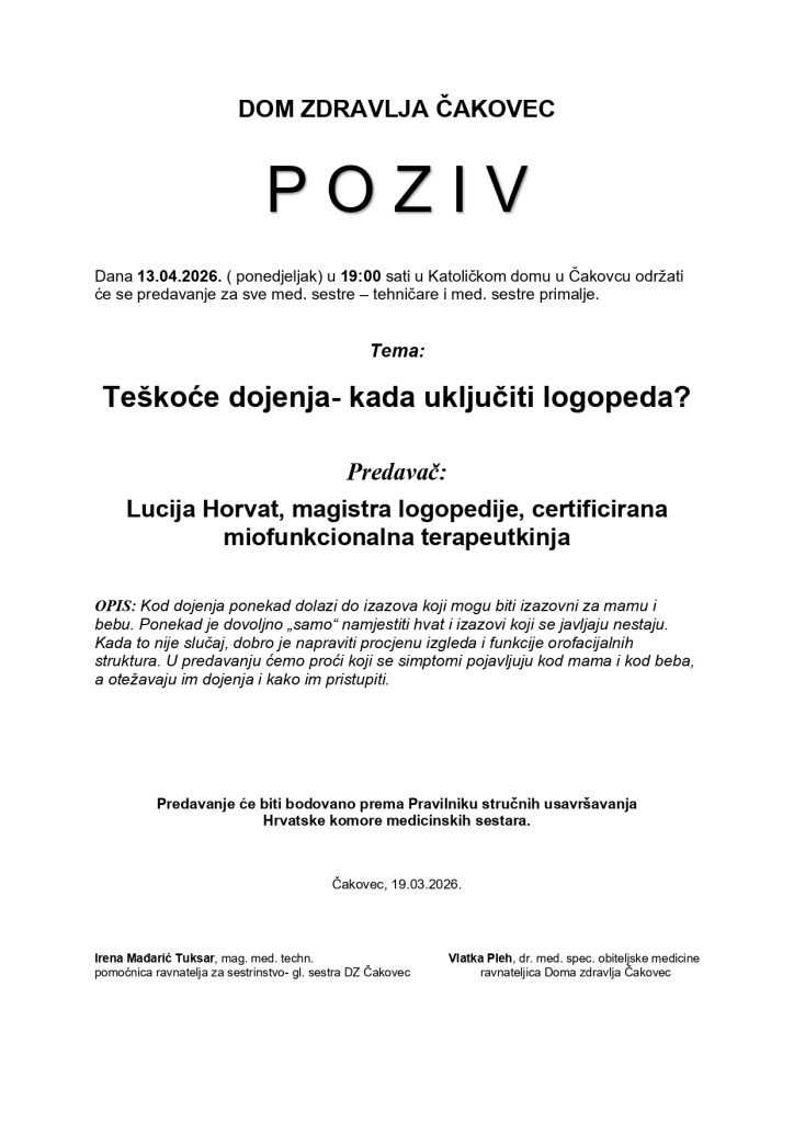 Poziv na predavanje: “Teškoće dojenja- kada uključiti logopeda?” – 13.04.2026., Katolički dom u Čakovcu